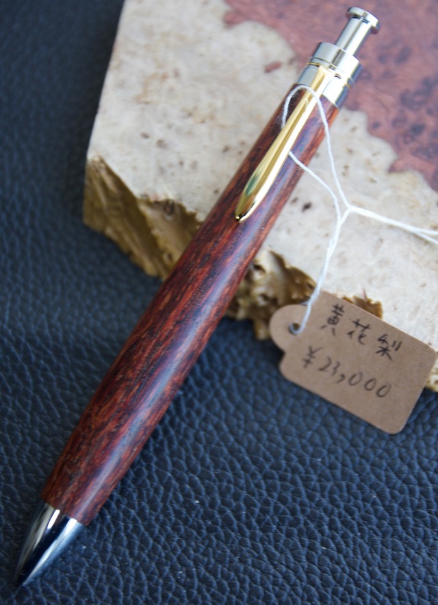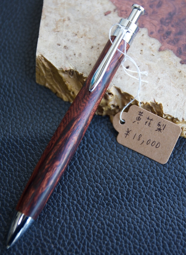 【品名】木軸ペン 【樹種】黄花梨 【サイズ】全長:140mm,軸径:13.6mm重量:約31g 【仕上げ】オイル艶あり 【木材の説明・ペンの説明】 黄花梨(おうかりん)は、主に中国で産出されるマメ科の高級銘木(香枝木)で、古くから明・清時代の最高級家具に使われてきた世界的な希少材です。非常に堅硬で美しい木目と香りを持ち、現在ではワシントン条約で保護され、入手不可能な絶滅危惧種として超高額で取引されています。 その希少性からか、某オークションサイト等で偽物が横行しており知らずに取引してしまっている方も多数おります。 当方は現地で直接取引して日本で銘木を販売しているバイヤー様から仕入れをしているため本品は本物だと思われます。 【付属品】 化粧箱 【金具・カラー】 三神シャープ1100・シルバー 【撮影機種】 Canon EOS 40D ※商品の購入についての注意点はショップの「ABOUT」をご確認ください